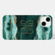 Elegant, stylish personalised cell phone case featuring turquoise teal agate, geode and marble with faux gold glitter with a monogram, initials or name shown in an editable modern font style in gold. OPTIONS: The sample is shown on an iPhone 14 Barely There case style--other phone models and case styles are available on the ordering page. ASSISTANCE: For help with design modification, personalisation, colour change or transferring the design to another product, contact the designer BEFORE ORDERING via the Zazzle Chat MESSAGE tab below or email makeitaboutyoustore@gmail.com.
