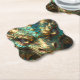 A coaster with a cool close up illustration of a turquoise and metallic gold dragon face with realistic eyes. Fantasy art realism dragon art.