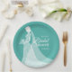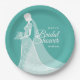 A chic bridal shower Paper plate featuring a bride wearing an elegant lace wedding gown on a turquoise background with beautiful script white text for your special bridal shower details.