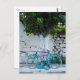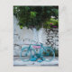 A turquoise bicycle leaning against a tree stands out against a white background on the island of Crete in Greece. This postcard is fully customisable.