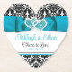 These personalised and romantic paper coasters for a wedding are perfect to use at your reception, bridal shower, or rehearsal dinner for whatever beverages or cocktails you are serving. These heart shaped black and white damask pattern wedding coasters are sure to be a memorable hit with your guests and are another way to keep a cohesive look throughout your wedding celebrations. The heart shape design area of these paper coasters has a turquoise ribbon and bow image with joined hearts images across the top. Below the ribbon, the words, "Cheers to Love!" are printed in black script with the names of the happy couple and the wedding date printed in turquoise blue and black. If you need any other matching items, please email niteowlstudio@gmail.com and watch your spam/junk folders for my reply, or use the Zazzle chat feature to contact me.