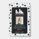 Vertical employee ID badge for a pet grooming business personalised with your business logo, and your employee's photo, name and title, pronouns, and badge number on a paw print pattern background in black and white.