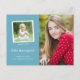 This graduation announcement features a classic design, two photos, and a turquoise blue background. The front of the postcard includes a large vertical photo on the right and a smaller square photo on the left. Below the square photo, add the graduate's name, class year, and school. On the back of the postcard, you can add a longer personal message and graduation party details.