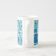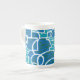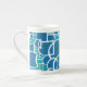 A stylish Bone China Mug with a turquoise, sea green, deep blue and white abstract pattern, from a silkscreen print by Judy Adamson.