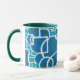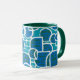A stylish white coffee mug with a green lip and handle and an abstract turquoise, sea green, deep blue and white pattern, from a silkscreen print by Judy Adamson.