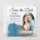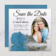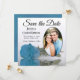 These beautiful modern floral save the date cards are the perfect way to let your friends and family know about your upcoming wedding. They feature an elegant design with a single long stemmed sky blue, turquoise, or azure coloured rose reflecting in a pool of water with waves and ripples with your photo in an oval shaped frame on a classic white background. The caption reads Save the Date with space for your names, the date, and location. The back is a marbled light blue colour.