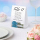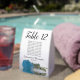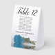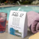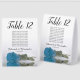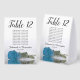 These tent table number signs are not only beautiful, they even include a list of names for the guests at each table, making it easy for your guests to find their seat at your wedding reception. The design is both elegant and romantic featuring a single sky blue, turquoise, or azure coloured rose lying on its side reflecting in water with waves and ripples. The title is in lacy script calligraphy with bold numbers so your guests can easily find the right table. There is room for the names of the couple and the wedding date.