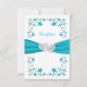 This romantic white and turquoise blue floral wedding reception enclosure card has an image of a pair of joined hearts overtop a teal or turquoise blue ribbon image running across the centre of the card. The backside has a turquoise blue background with your reception details or other information printed in white with a simulated silver floral and vine arch with joined hearts surrounding the wording. If you need any additional matching items, please email your request to niteowlstudio@gmail.com or use the Zazzle chat feature to get in touch.