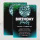 Retro birthday invitation featuring a shiny turquoise disco ball with green blue glitter on a black background. Perfect for your retro disco party, this invitation will set the tone for a fun and memorable celebration.