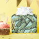 This turquoise exotic wrapping paper features a pattern of hand drawn illustrations of yellow bananas and green banana leaves against an elegant turquoise background with green raindrop details.