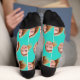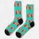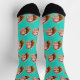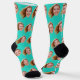 Funny custom women's face crew socks personalised with a photo cut-out and a turquoise background. Upload the face with a transparent background and it will automatically be replicated all over the socks, on both sides. To make the cut-out, you can download any mobile or computer app, or use the program named Canva or Photoshop.