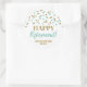 Happy retirement favour tag sticker with turquoise and gold confetti pattern.