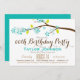 Cute, colourful, modern adult or teen birthday party invitation with turquoise, light blue flowers, lime green leaves, brown branch white background. Great year round for spring, summer, fall, or winter birthday parties. Neutral trendy design for man or woman, boy or girl. Stylish, classy invite for any adult or teen milestone birthday including Sweet 16, 18th, 21st, 30th, 40th, 50th, 60th, 70th, 75th, 80th, 85th, 90th, 95, 100th birthday.