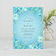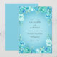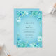 This design features a radiant watercolor border of lush roses and delicate ranunculus in shades of turquoise and sky blue. The soft gradient background creates a serene and airy atmosphere perfect for a coastal or springtime event. Green foliage and blooming petals accent the central area, offering a polished and artistic aesthetic. The cool colour palette evokes a sense of tranquillity and elegance.