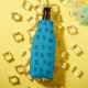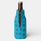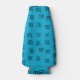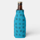 This bottle cooler has a mid-century modern design of scattered mazes on a field of turquoise.