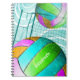 Colourful girls' volleyball spiral notebook with volleyballs and net graphics composite - the volleyball panels are multicolored with hot pink, lime, orange and aqua panels, and her name is customisable - by katz_d_zynes