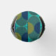 This bottle cooler has a mid-century modern design of ovals in teal with semi-circles in green and navy inside them on a field of turquoise.