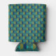 This can cooler has a mid-century modern design of ovals in teal with semi-circles in green and navy inside them on a field of turquoise.