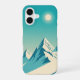 A cool retro design depicting snowy mountains beneath a bright turquoise sky, illustrated with clean shapes and classic vintage textures.