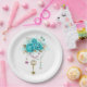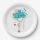 Antique gold key with trendy turquoise roses decorated with leaves of white gold and pink and blue beads. Fashionable colour. Turquoise roses. White gold. Blue tiffany.