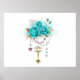 Antique gold key with trendy turquoise roses decorated with leaves of white gold and pink and blue beads. Fashionable colour. Turquoise roses. White gold. Blue tiffany.