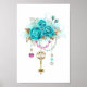 Antique gold key with trendy turquoise roses decorated with leaves of white gold and pink and blue beads. Fashionable colour. Turquoise roses. White gold. Blue tiffany.