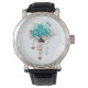 Antique gold key with trendy turquoise roses decorated with leaves of white gold and pink and blue beads. Fashionable colour. Turquoise roses. White gold. Blue tiffany.