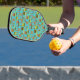 This pickleball paddle has a mid-century modern design of rounded rectangles in shades of green and brown with holes in them on a field of turquoise. If you like the design but prefer different colours, message me.