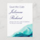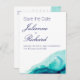 A modern and elegant watercolor "save the date" postcard, features an abstract turquoise sea, all your details are spelled in a mix of modern and script typo.