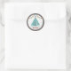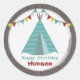 A camping themed birthday sticker featuring an illustration of a turquoise tipi and bunting.  Background is wood inspired.  Personalise the text. Look for matching invitations at Jill's Paperie.