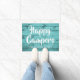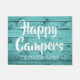 Fun, rustic beach wood look doormat is great gift for retired couples, hikers, rvers, campers, and nature lovers- Personalised, aqua turquoise colour welcome doormat reads 'Happy Campers' in bold, handwritten look lettering. Text template below for adding family name (or any custom text) in white, fun style letter. Against a background of rustic, stained turquoise bleached out beach look, wood boards. Great retirement gift, too. Would look perfect in front of an RV or cosy beach house to welcome guests.