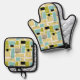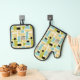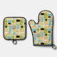 Add a pop of colour to your cooking with these funky mid-century modern oven mitt and pot holder! This retro design features aqua blue, avocado green, yellow, and tan abstract rectangles, along with highlights of black and white starbursts.