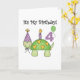 A cute green smiling turtle wearing a party hat carries a lit birthday candle on his back and text reads "It's My Birthday". A helium balloon carries the number 4!