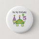 A cute green smiling turtle wearing a party hat carries a lit birthday candle on his back and text reads "It's My Birthday". A helium balloon carries the number 5!