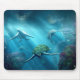 Somewhere in ocean shallows, a group of sea turtles swims through a tight passageway between underwater rocks. Seaweed and urchins cover the rocky walls of the aquatic canyon, while bubbles rise to the surface from the deep. Meanwhile, rays of sunlight cut through the water, broken by the rippling surface of the sea above. The five ancient sea creatures swim slowly and majestically towards the viewer through the natural alley in the blue undersea world.