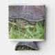 The close-up face of a yellow-bellied Slider turtle peeks out of her shell.