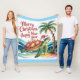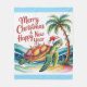 A whimsical Christmas greeting card featuring a cheerful watercolor illustration of a sea turtle sporting a festive Santa hat and adorned with twinkling Christmas lights strung around its shell, set against a backdrop of a swaying palm tree also illuminated with warm lights and a serene turquoise ocean. The turtle's shell is painted with intricate patterns of tropical flowers in soft pastel hues of coral, lavender, and seafoam green, while the ocean shimmers with subtle gradients of blue and silver, creating a peaceful yet celebratory atmosphere. "MERRY CHRISTMAS & HAPPY NEW YEAR" appears in a playful, hand-lettered font across the top of the card, with the interior offering a clean white space for a personalised message and a subtle, repeating pattern of small seashells along the bottom edge to reinforce the tropical theme. The overall tone is lighthearted and joyful, perfect for sending warm wishes to friends and family during the holiday season.