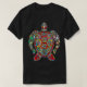 I give wanted to give this a 4 instead of a 5 because these Basic DARK T0shirts run unexpectedly SLIM or Narrow. Which is great if you do not have a potbelly, but I have a paunch. It isn't the shirt's fault that I've got a beer belly. The design and shirt itself is a quality cotton shirt. The color is more of a deep purple, but still a very pretty color. The Basic DARK T-shirts run a bit SLIMMER than the Basic Ts. The neck is a fraction narrower (or seems to be narrower) also. I'm a paunchy middle-aged woman and my neck is 12 inches (31cm) thick and the neckline fell about the same as in the photo of the man, and I had the desire to tug it a bit. So if you're a thick necked man or like loose shirts, be aware these are slimmer shirts. Once I get rid of my lockdown paunch it'll look great. The shirt washed well in cold water with no apparent bleeding. We don't have a dryer, so it hung dry. Did not shrink. Love the colors and the design. The design looks smaller on my shirt than it does on the model on-line. But still, it looks good on the shirt. The printing looks as it does on the model, just the size seems fractionally smaller. Washed garment in cold water, hung dry and design appeared unaffected.