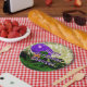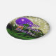 Sparkly Turtle paper plates with Happy Birthday and personalised text. Purple and gold with sparkles, mushroom and turtle.