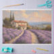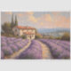 This enchanting landscape artwork features a winding path through blooming lavender fields leading to a rustic stone cottage with a red-tiled roof. Set against rolling hills and a pastel sky, this romantic countryside scene evokes the charm of Provence or Tuscany