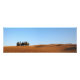 Panorama photo print of a small group of cypress trees in a small forest between the rolling barren hills in autumn in the Val d'Orcia, Tuscany, Italy. Panoramic print, great for home decoration above a sofa.