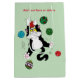 Black and white tuxedo cat falling with Christmas ornaments in a backdrop of green. Hang In There this Holiday Season.