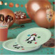 Black and white tuxedo cat falling with Christmas ornaments in a backdrop of green. Hang In There this Holiday Season.