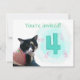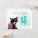 Painting of the number four in green with pink swirl ribbons, with a photo of our black and white tuxedo cat wearing a pink and white striped dressed, with You're invited, is printed on birthday party invitations. Easily customise the text on both sides, on the template forms.