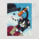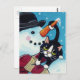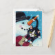 Cute cat themed festive postcard featuring a reproduction of an original painting by Lisa Marie Robinson. A black and white cat tuxedo cat sitting on the shoulder of a snowman trying to steal his scarf. The snowman has a carrot nose and is wearing a bowler hat. Copyright © Lisa Marie Robinson. All Rights Reserved.