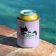 Cute black and white tuxedo kitten sitting in a blue dog's bowl against a backdrop of purple.