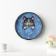 This fun novelty clock includes a faux (printed) denim / blue jean look and includes a cartoon black and white tuxedo kitty cat that appears as if it's sitting inside a pocket! The design also includes "patches" (printed) that resemble the silhouettes of paw prints. Time is kept with printed "buttons." Use the easy template to add your name or your cat's name to the design (or simply delete the sample name "Tabitha" to order without a name). These cute clocks make the perfect gift for any cat owner! They would also be fun for an animal groomer or vet.