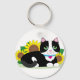 Black and white tuxedo cat lying down in a bed of sunflowers