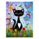 A black and white tuxedo cat sitting amongst the grass and flowers in a colourful garden. Surrounding her are flowers and leaves and colourful shapes. She has the prettiest green eyes and is wearing a red collar.