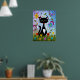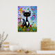 A black and white tuxedo cat sitting amongst the grass and flowers in a colourful garden. Surrounding her are flowers and leaves and colourful shapes. She has the prettiest green eyes and is wearing a red collar.
